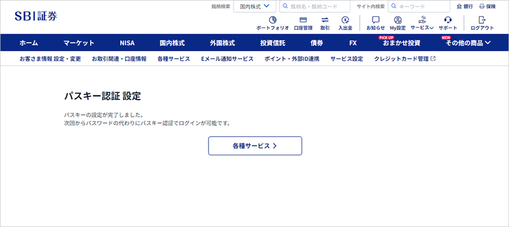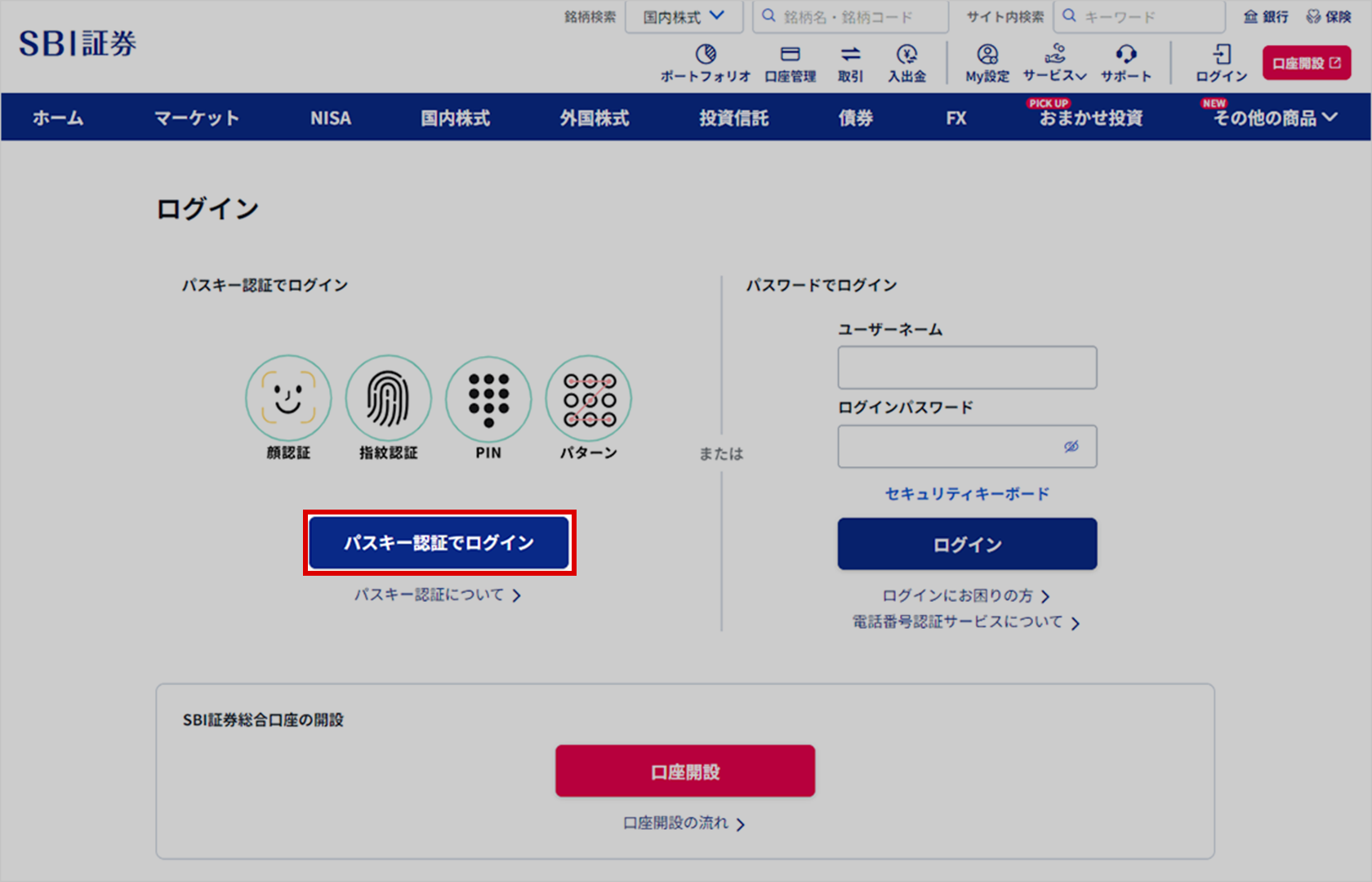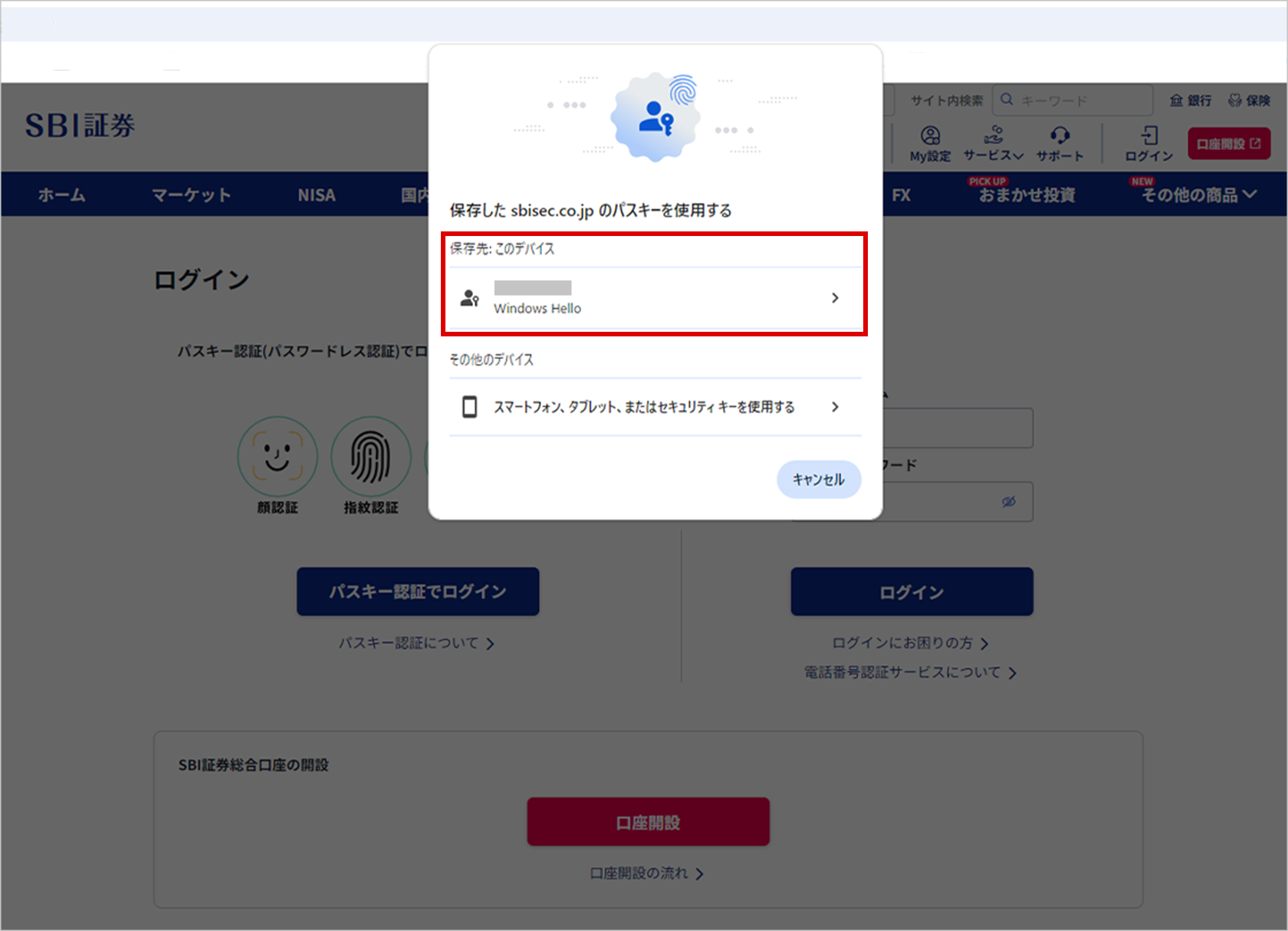 ホームサービス案内セキュリティパスキー認証パスキー認証2025/10/25(土)より「パスキー認証」の提供を開始いたしました2025/10/25(土)より、SBI証券メインサイトへログイン時の多要素認証として「パスキー認証」を導入いたしました。また、「パスキー認証」導入に伴い、当社WEBサイトのトップページにおけるログイン導線の変更をいたしました。変更内容は以下よりご確認ください。当社WEBサイトへのログイン導線変更のお知らせ(2025/10/25(土))パスキー認証とはパスキー導入後のログイン画面SBI証券WEBサイトでの設定方法パスキー認証を利用したログイン方法パスキー登録状況の確認・解除方法お客さまから多く寄せられるケースと対応方法よくあるご質問パスキー認証とは「パスキー認証」とは、登録された生体情報(指紋認証、顔認証、PINコード、パターン認証など)により本人確認を行う、ログイン時の認証方法です。パスキー認証を利用してメインサイトへログインする場合には、ユーザーネーム・ログインパスワードの入力や「デバイス認証」や「電話番号認証」などの多要素認証が不要になります。 パスキー認証のサービス概要認証対象証券口座へのログイン利用チャネルメインサイト(PC・スマートフォン)その他チャネルへの導入も順次行う予定です。導入決定時には当社WEBサイト上にて改めてお知らせいたします。利用条件事前にSBI証券でパスキーの登録とパスキーを利用する機器側の設定が必要です。既存のログイン方法も併用できますパスキー認証の設定後も、ユーザネームとログインパスワードを使用してログインができます。この場合、ユーザーネームとログインパスワードに加えて、追加認証(多要素認証)が必要となります。(フィッシング詐欺等には十分ご注意ください)なお、パスキー認証を設定されたお客さまが、ユーザネーム/ログインパスワードによるログインをできない(入力欄を表示しない)ように設定可能な機能を2026年初旬以降に提供予定です。今後のセキュリティ機能強化のご案内パスキー導入後のログイン画面パスキー認証のリリースに伴い、当社WEBサイトのトップページにおけるログイン導線の変更をいたしました。トップページのログインエリアに設置している「ユーザーネーム」「ログインパスワード」の入力欄が廃止となり、「ログイン」ボタンを押すことでログイン情報を入力する画面に遷移する形式へと変更となります。 当社WEBサイト(ログイン画面)の正しいURLhttps://login.sbisec.co.jpユーザーネーム・ログインパスワードを忘れてしまった場合ログイン画面の変更により保存していたパスワードが自動入力されなくなりログインができない場合、以下のように、Googleパスワードマネージャー等のパスワード管理画面に遷移いただくと、保存されたパスワード情報をご確認いただくことが可能な場合があります。Google Chromeの場合 Microsoft Edgeの場合 上記のパスワード管理画面でも、ユーザーネーム・ログインパスワードが分からない場合は再設定等を行っていただき、ログインしてください。ユーザーネーム照会サービスログインパスワード再設定SBI証券WEBサイトでの設定方法SBI証券でパスキー認証をご設定いただく前にパスキーを利用するためには、事前にご利用の端末またはブラウザ側で登録設定が必要です。ご利用環境に応じた設定方法については、各メーカーまたはサービス提供元の公式サポート情報をご確認ください。クラウド上に保存するパスキーパスキーを登録した端末以外でも、同じクラウドサービスのアカウントを使用していれば、複数の端末でパスキーを利用してログインできます。GoogleのGoogleパスワードマネージャーを利用する場合AppleのiCloudキーチェーンを利用する場合(もしくは”パスワード”アプリ)外部サイトに遷移します。ローカル(端末)上に保存するパスキー特定のデバイス(スマートフォンやパソコン、セキュリティキーなど)に保存され、そのデバイスでしか使用できないパスキーです。複数の端末で利用する場合は、端末ごとに登録が必要です。MicrosoftのWindows Helloを利用する場合外部サイトに遷移します。また、お使いのPCでサインインや画面ロック解除時に生体認証、またはPINを使用したことがない場合は事前に端末上での設定が必要となる場合があります。Windows Helloの構成MacでTouch IDを使用する外部サイトに遷移します。Stepパスキー認証の設定画面を開くログイン後の当社WEBサイトホームの「セキュリティ設定」をクリックしてください。 パスキー認証欄の「変更」をクリックしてください。 Step認証コードを入力し認証へ進む取引パスワードを入力して、「パスキーを設定」ボタンをクリックしてください。 登録メールアドレス宛に認証コードを記載したメールが送信されるので、メールに記載の認証コードをWEBサイトの認証コード入力欄に入力して、「認証」ボタンをクリックしてください。 Step機器の認証を行い、パスキーの登録を完了させる例とし