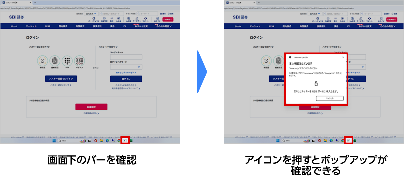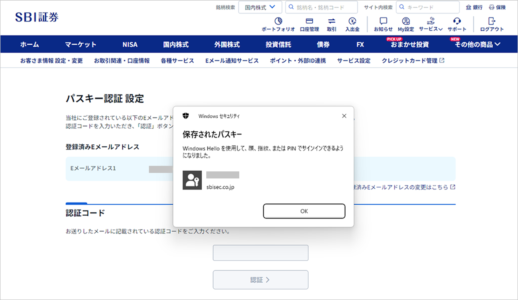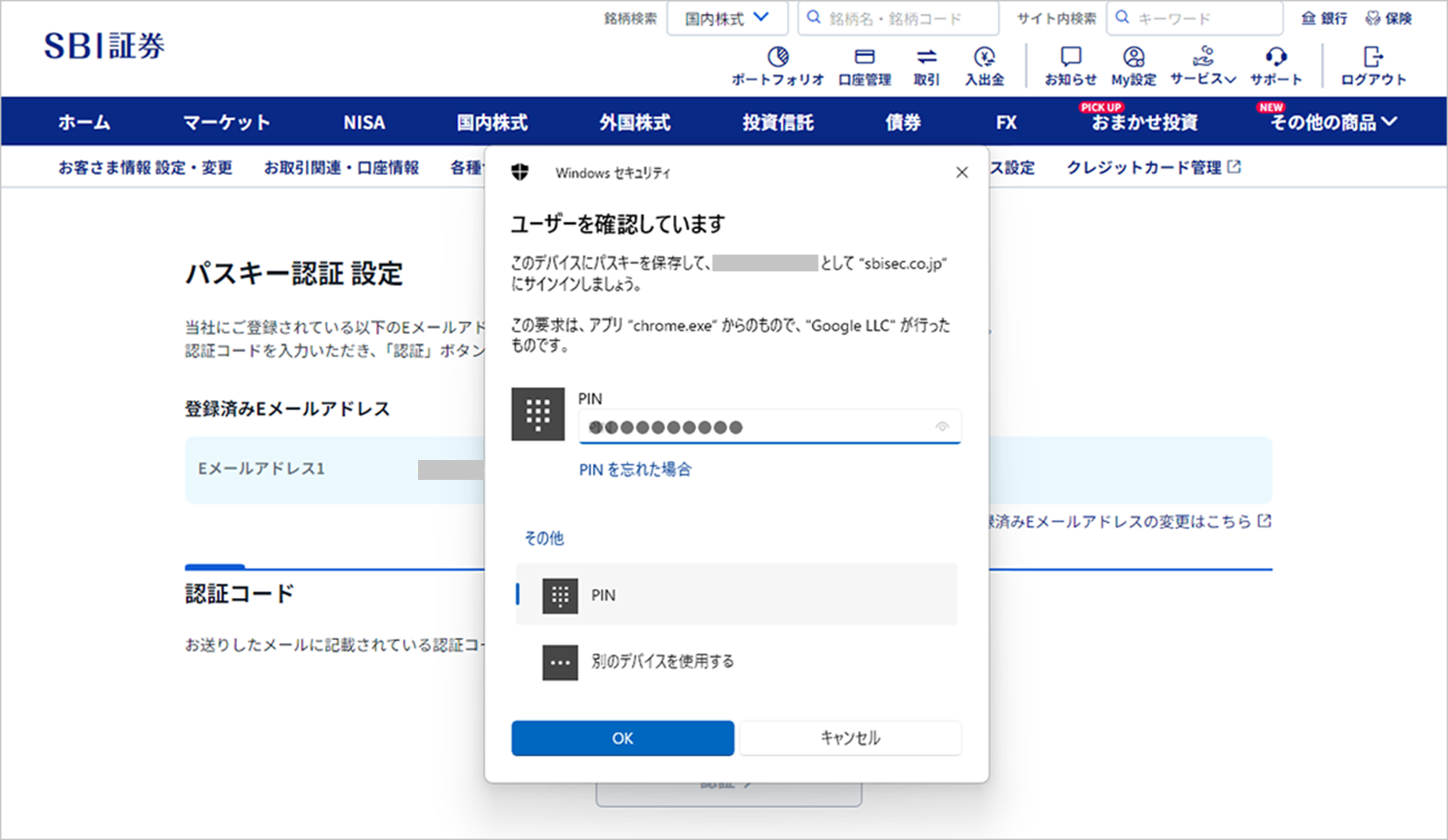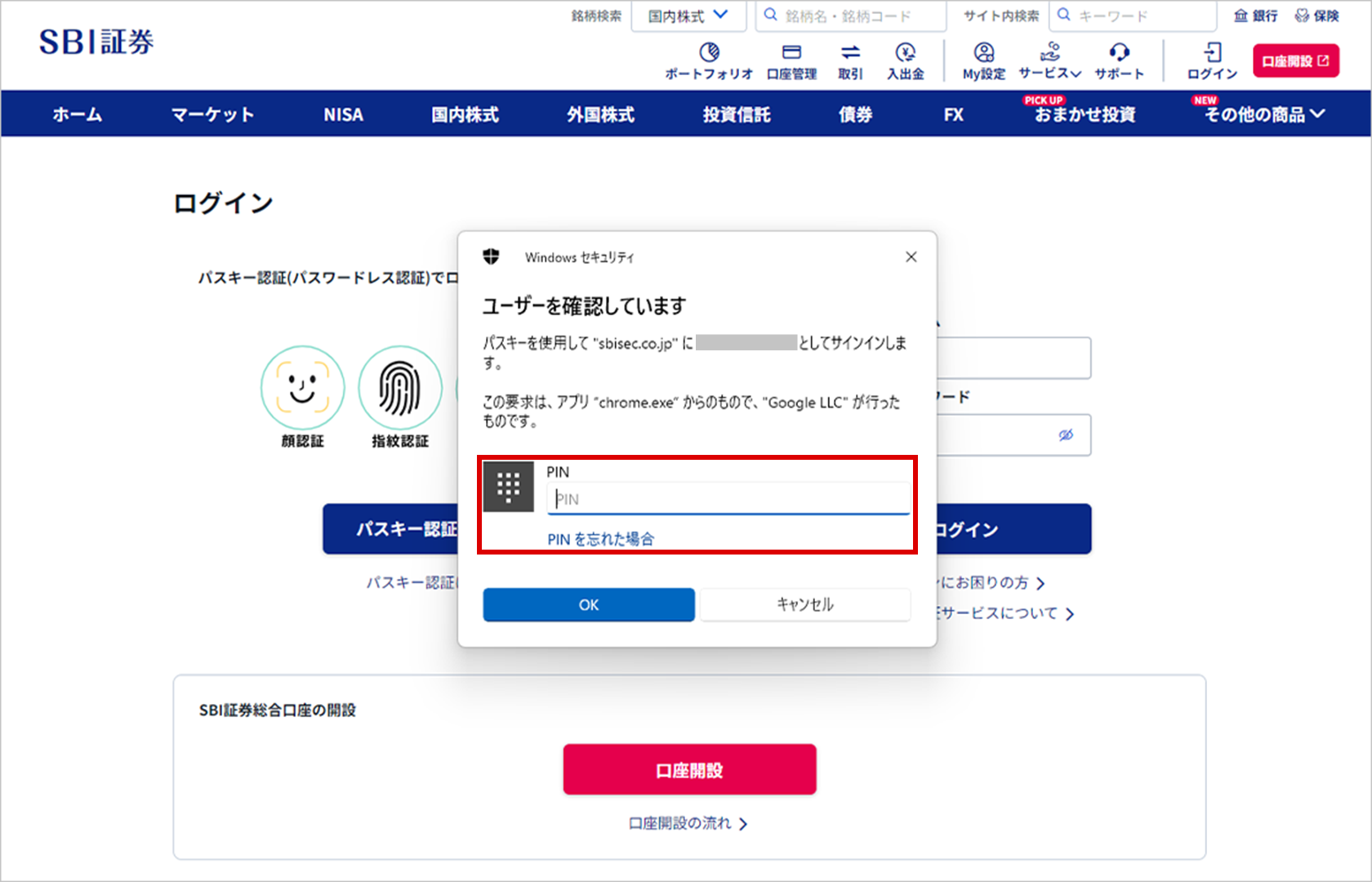 ホームサービス案内セキュリティパスキー認証パスキー認証2025/10/25(土)より「パスキー認証」の提供を開始いたしました2025/10/25(土)より、SBI証券メインサイトへログイン時の多要素認証として「パスキー認証」を導入いたしました。また、「パスキー認証」導入に伴い、当社WEBサイトのトップページにおけるログイン導線の変更をいたしました。変更内容は以下よりご確認ください。当社WEBサイトへのログイン導線変更のお知らせ(2025/10/25(土))パスキー認証とはパスキー導入後のログイン画面SBI証券WEBサイトでの設定方法パスキー認証を利用したログイン方法パスキー登録状況の確認・解除方法お客さまから多く寄せられるケースと対応方法よくあるご質問パスキー認証とは「パスキー認証」とは、登録された生体情報(指紋認証、顔認証、PINコード、パターン認証など)により本人確認を行う、ログイン時の認証方法です。パスキー認証を利用してメインサイトへログインする場合には、ユーザーネーム・ログインパスワードの入力や「デバイス認証」や「電話番号認証」などの多要素認証が不要になります。 パスキー認証のサービス概要認証対象証券口座へのログイン利用チャネルメインサイト(PC・スマートフォン)その他チャネルへの導入も順次行う予定です。導入決定時には当社WEBサイト上にて改めてお知らせいたします。利用条件事前にSBI証券でパスキーの登録とパスキーを利用する機器側の設定が必要です。既存のログイン方法も併用できますパスキー認証の設定後も、ユーザネームとログインパスワードを使用してログインができます。この場合、ユーザーネームとログインパスワードに加えて、追加認証(多要素認証)が必要となります。(フィッシング詐欺等には十分ご注意ください)なお、パスキー認証を設定されたお客さまが、ユーザネーム/ログインパスワードによるログインをできない(入力欄を表示しない)ように設定可能な機能を2026年初旬以降に提供予定です。今後のセキュリティ機能強化のご案内パスキー導入後のログイン画面パスキー認証のリリースに伴い、当社WEBサイトのトップページにおけるログイン導線の変更をいたしました。トップページのログインエリアに設置している「ユーザーネーム」「ログインパスワード」の入力欄が廃止となり、「ログイン」ボタンを押すことでログイン情報を入力する画面に遷移する形式へと変更となります。 当社WEBサイト(ログイン画面)の正しいURLhttps://login.sbisec.co.jpユーザーネーム・ログインパスワードを忘れてしまった場合ログイン画面の変更により保存していたパスワードが自動入力されなくなりログインができない場合、以下のように、Googleパスワードマネージャー等のパスワード管理画面に遷移いただくと、保存されたパスワード情報をご確認いただくことが可能な場合があります。Google Chromeの場合 Microsoft Edgeの場合 上記のパスワード管理画面でも、ユーザーネーム・ログインパスワードが分からない場合は再設定等を行っていただき、ログインしてください。ユーザーネーム照会サービスログインパスワード再設定SBI証券WEBサイトでの設定方法SBI証券でパスキー認証をご設定いただく前にパスキーを利用するためには、事前にご利用の端末またはブラウザ側で登録設定が必要です。ご利用環境に応じた設定方法については、各メーカーまたはサービス提供元の公式サポート情報をご確認ください。クラウド上に保存するパスキーパスキーを登録した端末以外でも、同じクラウドサービスのアカウントを使用していれば、複数の端末でパスキーを利用してログインできます。GoogleのGoogleパスワードマネージャーを利用する場合AppleのiCloudキーチェーンを利用する場合(もしくは”パスワード”アプリ)外部サイトに遷移します。ローカル(端末)上に保存するパスキー特定のデバイス(スマートフォンやパソコン、セキュリティキーなど)に保存され、そのデバイスでしか使用できないパスキーです。複数の端末で利用する場合は、端末ごとに登録が必要です。MicrosoftのWindows Helloを利用する場合外部サイトに遷移します。また、お使いのPCでサインインや画面ロック解除時に生体認証、またはPINを使用したことがない場合は事前に端末上での設定が必要となる場合があります。Windows Helloの構成MacでTouch IDを使用する外部サイトに遷移します。Stepパスキー認証の設定画面を開くログイン後の当社WEBサイトホームの「セキュリティ設定」をクリックしてください。 パスキー認証欄の「変更」をクリックしてください。 Step認証コードを入力し認証へ進む取引パスワードを入力して、「パスキーを設定」ボタンをクリックしてください。 登録メールアドレス宛に認証コードを記載したメールが送信されるので、メールに記載の認証コードをWEBサイトの認証コード入力欄に入力して、「認証」ボタンをクリックしてください。 Step機器の認証を行い、パスキーの登録を完了させる例とし