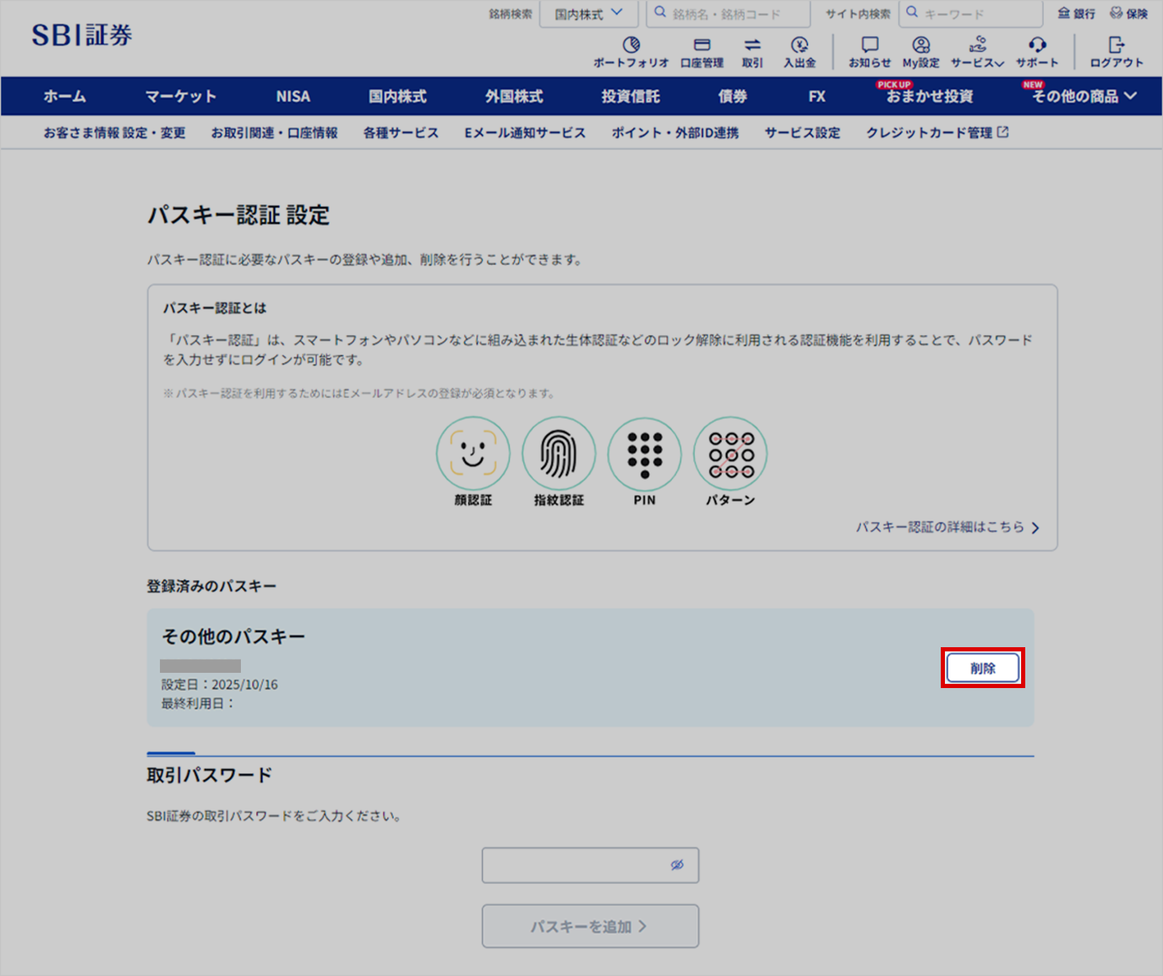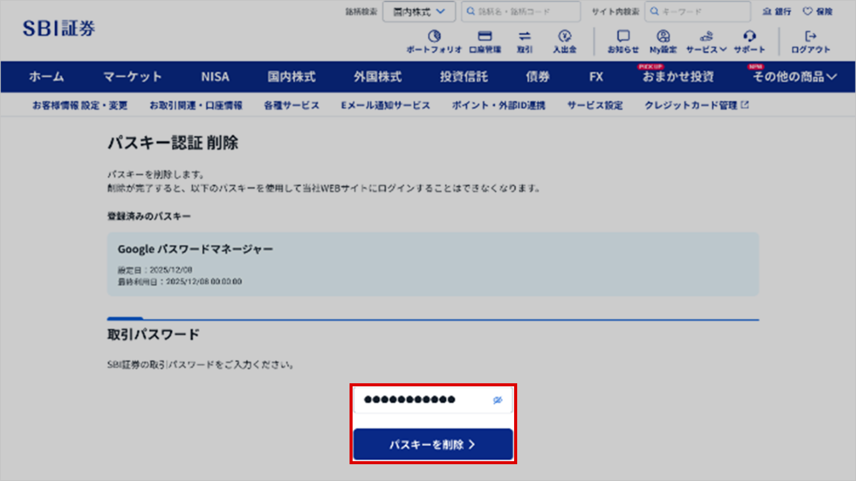 取引パスワードを入力して、「パスキーを削除」ボタンをクリックしてください。