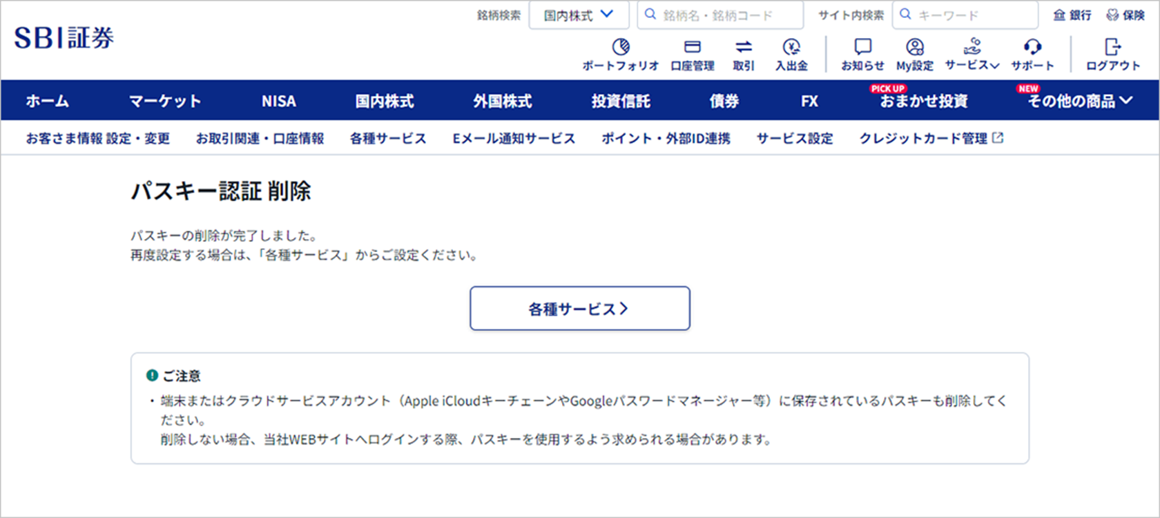 「パスキーの削除が完了しました」と表示されたら当社WEBサイトでの削除手続きが完了となります。完了後、登録メールアドレス宛に、削除完了メールをお送りします。