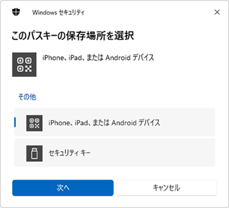 PCで生体認証やPINを使用していない場合はスマホと組合わせることでパスキーを利用できますお使いのPCでサインインや画面ロック解除時に生体認証、またはPINを使用したことがない場合、以下画像のように「スマートフォン」と「セキュリティ キー(物理キー)」の選択肢のみが表示されます。