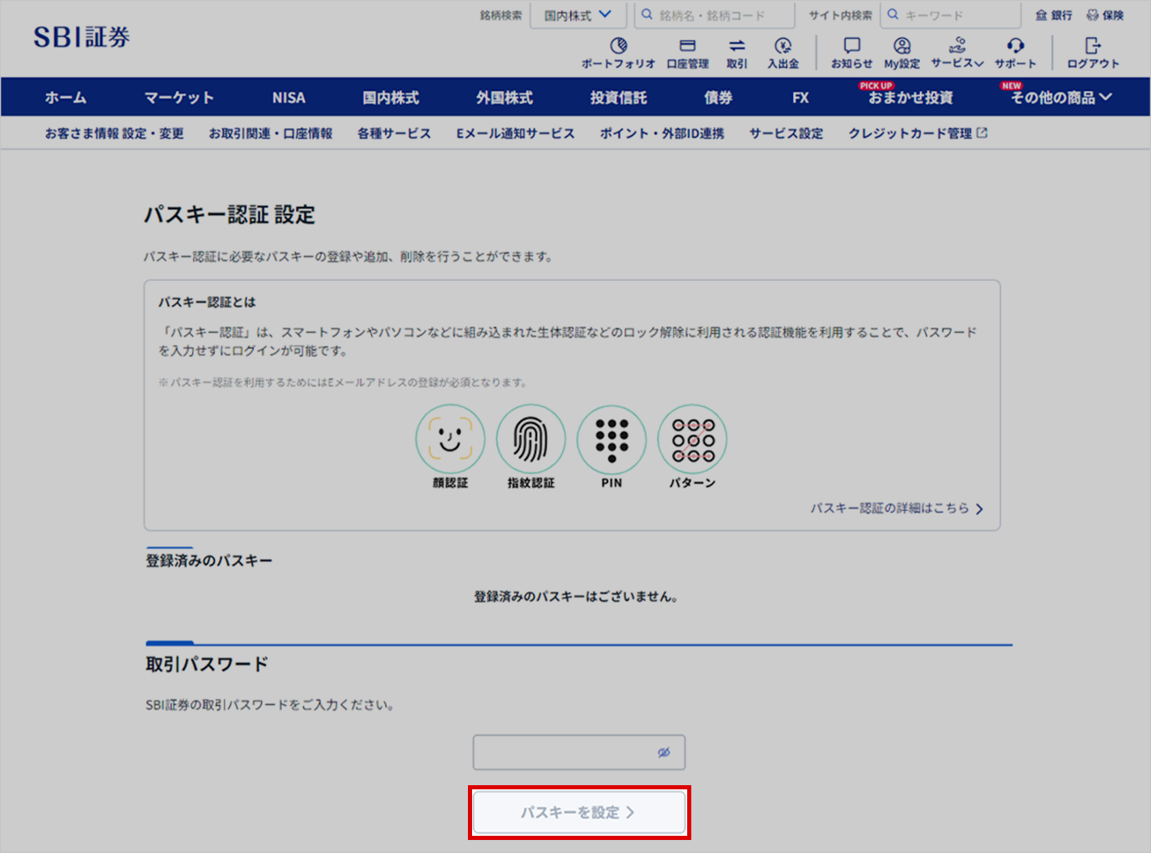 Step認証コードを入力し認証へ進む取引パスワードを入力して、「パスキーを設定」ボタンをクリックしてください。