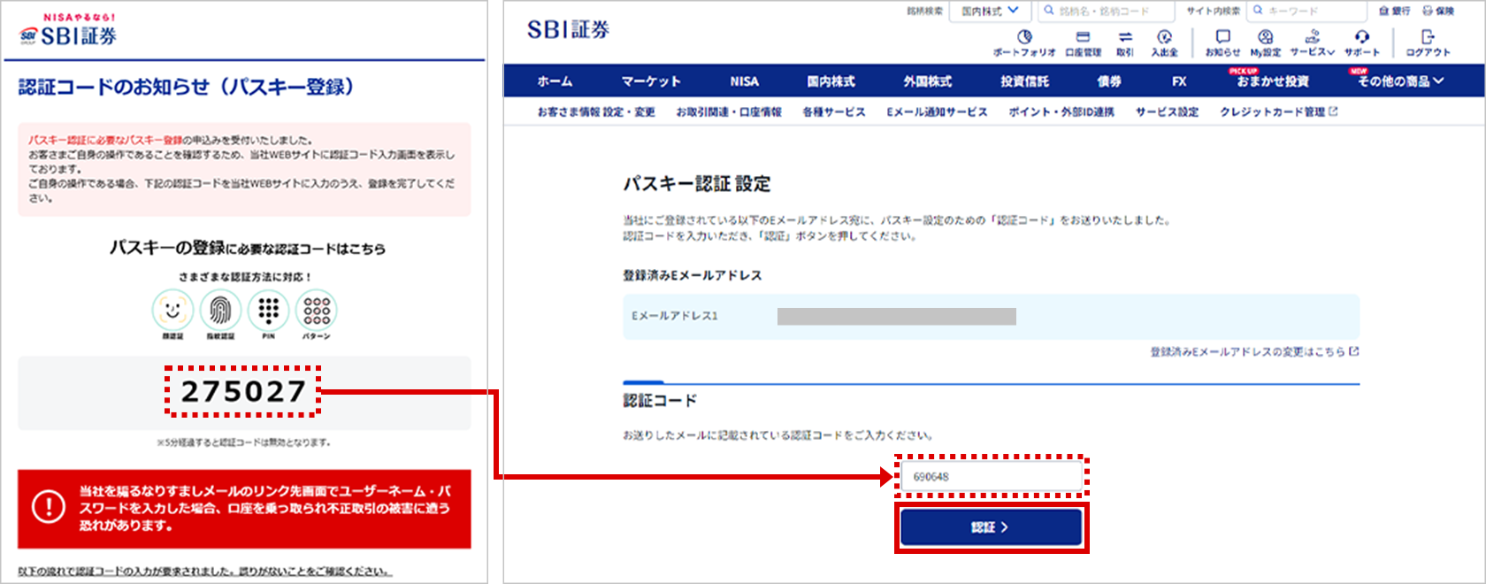登録メールアドレス宛に認証コードを記載したメールが送信されるので、メールに記載の認証コードをWEBサイトの認証コード入力欄に入力して、「認証」ボタンをクリックしてください。