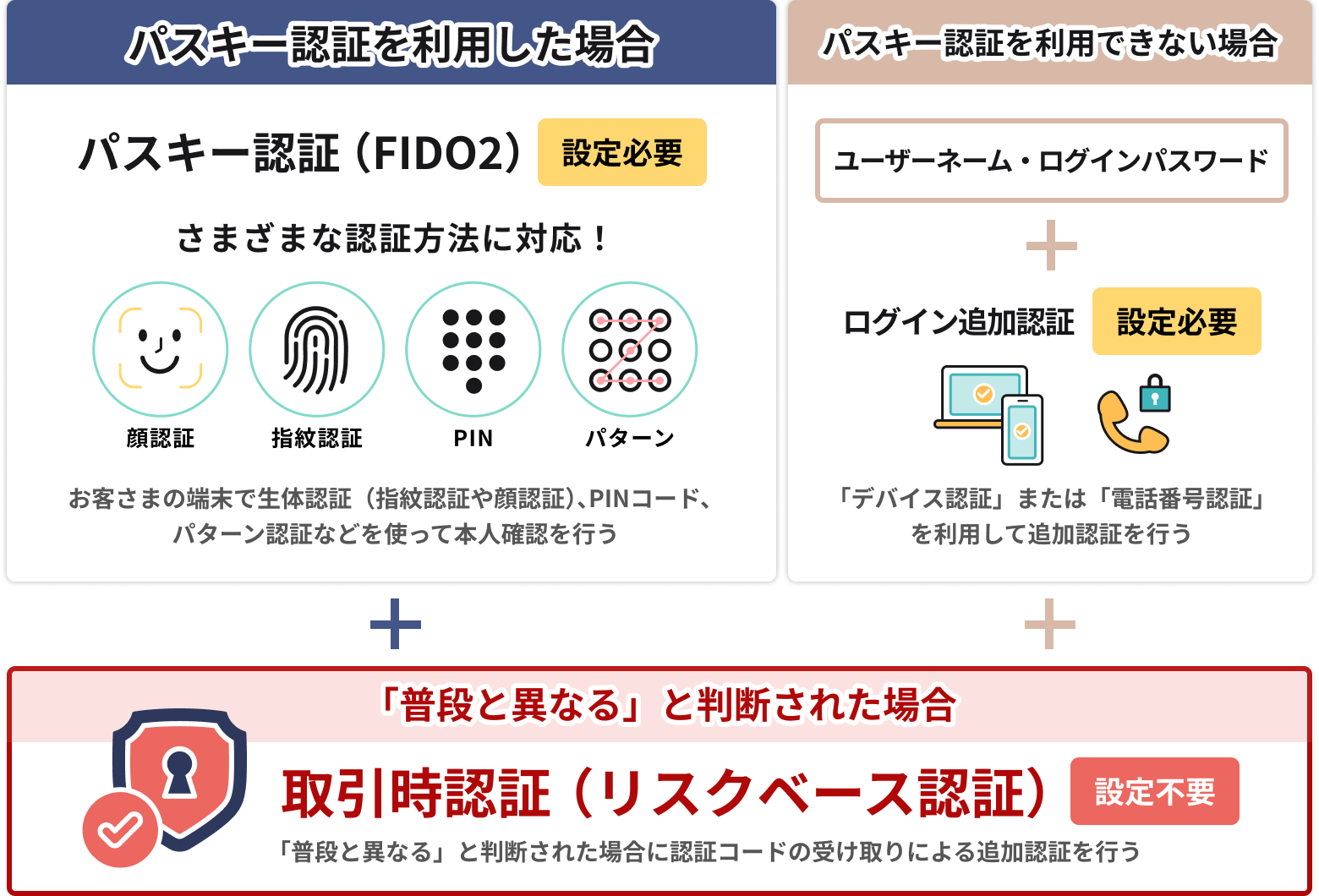 パスキー認証のサービス概要認証対象証券口座へのログイン利用チャネルメインサイト(PC・スマートフォン)その他チャネルへの導入も順次行う予定です。導入決定時には当社WEBサイト上にて改めてお知らせいたします。利用条件事前にSBI証券でパスキーの登録とパスキーを利用する機器側の設定が必要です。既存のログイン方法も併用できますパスキー認証の設定後も、ユーザネームとログインパスワードを使用してログインができます。この場合、ユーザーネームとログインパスワードに加えて、追加認証(多要素認証)が必要となります。(フィッシング詐欺等には十分ご注意ください)なお、パスキー認証を設定されたお客さまが、ユーザネーム/ログインパスワードによるログインをできない(入力欄を表示しない)ように設定可能な機能を2026年初旬以降に提供予定です。